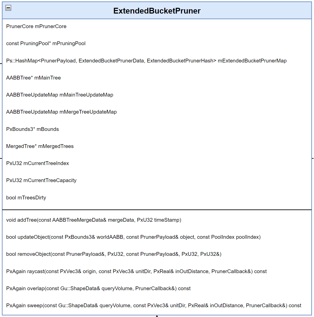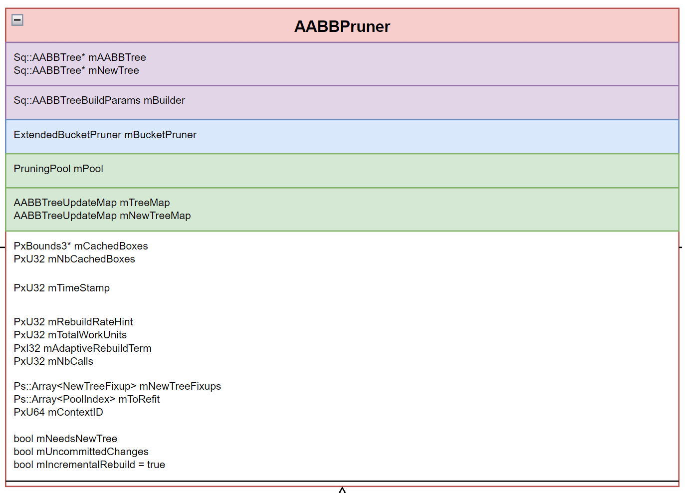 - mPool:维护所有对象的 bound、shape、actor 关系,同时也是构建 AABBTree 和 IncrementAABBTree 的数据来源。