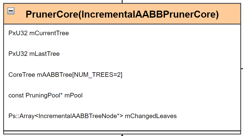 mMergedTrees:其中 mMergedTrees 是一棵棵的 AABBTree。因为 PhysX 不仅支持向场景内添加单个 Actor,还支持多个 Actor 打包成 PruningStructure 添加到场景,这里就不做过多展开,简单理解就是除了支持添加一个树节点以外,还支持添加整棵树,mMergedTrees 就是那个存储树的结构。