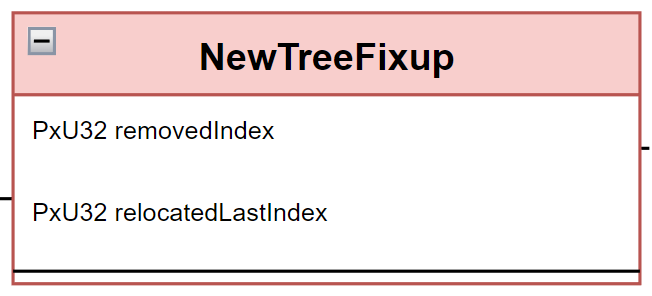 NewTreeFixup 用来记录删除包围盒操作所影响的两个包围盒下标。至于为什么是两个,之前在 PruningPool 中也有简单的介绍,为了保证数组连续,会用末尾的数据填充到删除位置,因此删除操作实际上是一次替换,把最后一个位置的数据替换到删除位置,所以这里需要记录两个下标。具体删除细节可以回顾一下 PruningPool.removeObject。