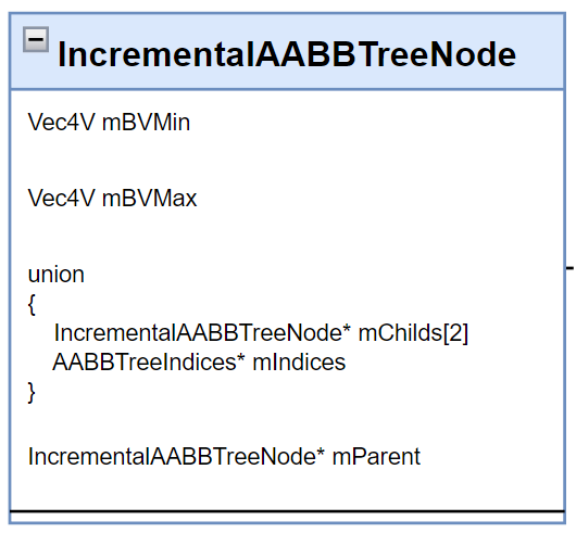 功能上和 AABBTreeRuntimeNode 近似,表示 IncrementalAABBTree 最小单位。不过节点大小是 AABBTreeRuntimeNode 的两倍(28 vs 56)。